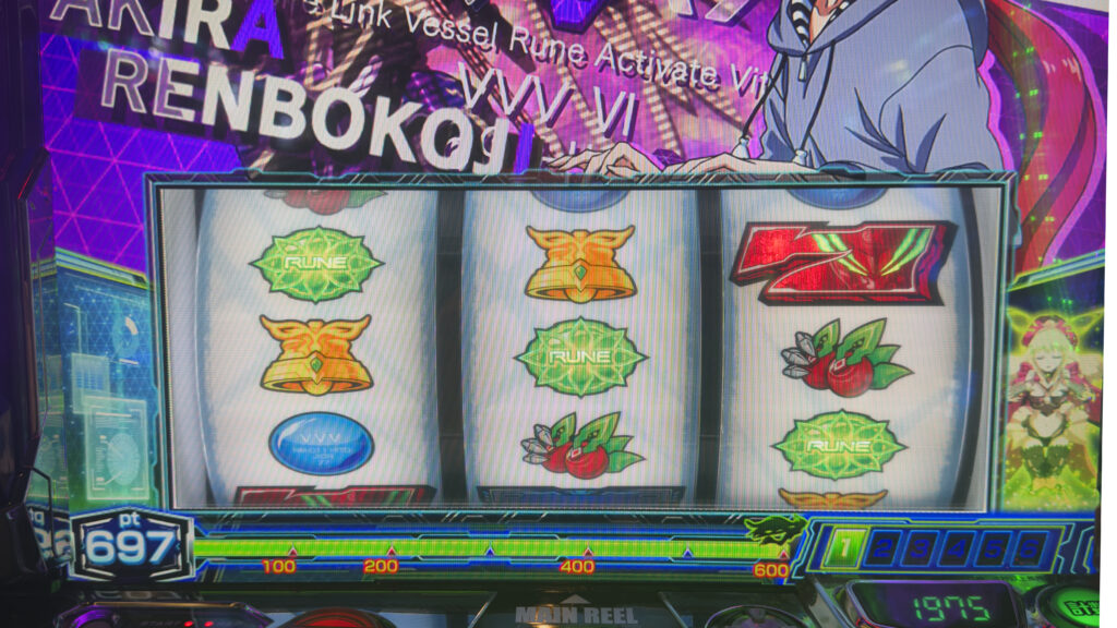 その後も勢いは止まりません。3周期目の100のゾーンで再び決戦ボーナスから4度目の超革命へ! RUSH9回で持ちメダルは6,929枚。 さらに1周期目早々に引いたルーン図柄から電脳ゾーン10セット到達。革命ボーナスへと繋げ、この日最高出玉の7,373枚をマークしました。